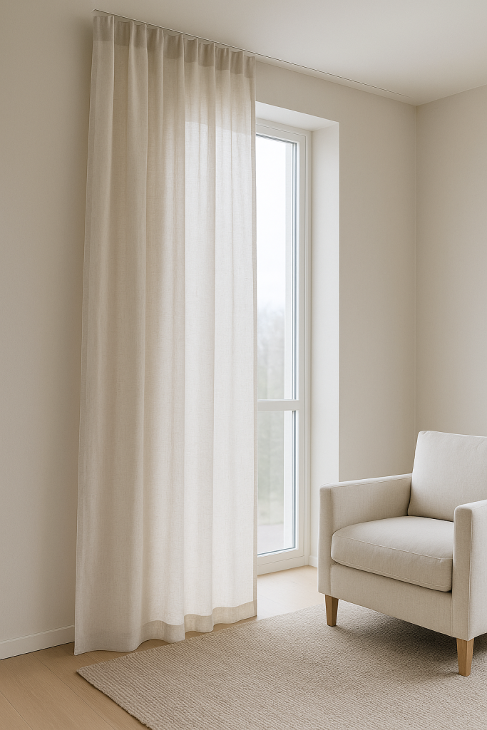 Linnegardiner med veckband är något alldeles magiskt. Linnegardinerna med veckband kan fästas i skena som antingen sitter på väggen eller i taket. Att ha linnegardiner från golv till tak skapar en sådan lyxig och inbonad känsla. Rummet känns mer harmoniskt och mjukt.