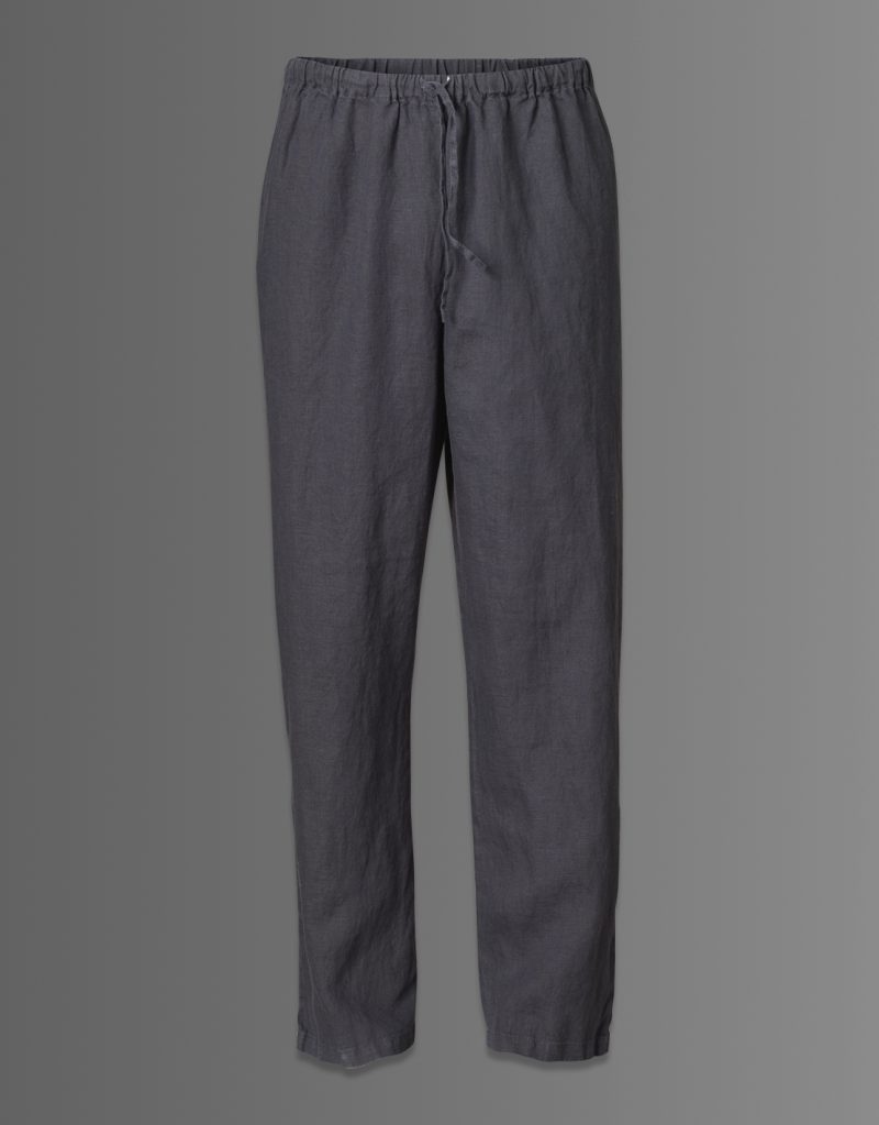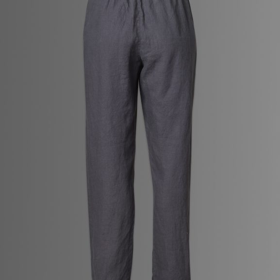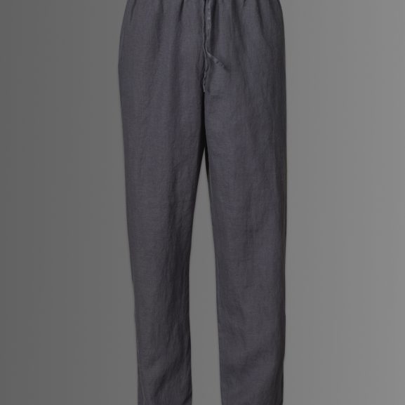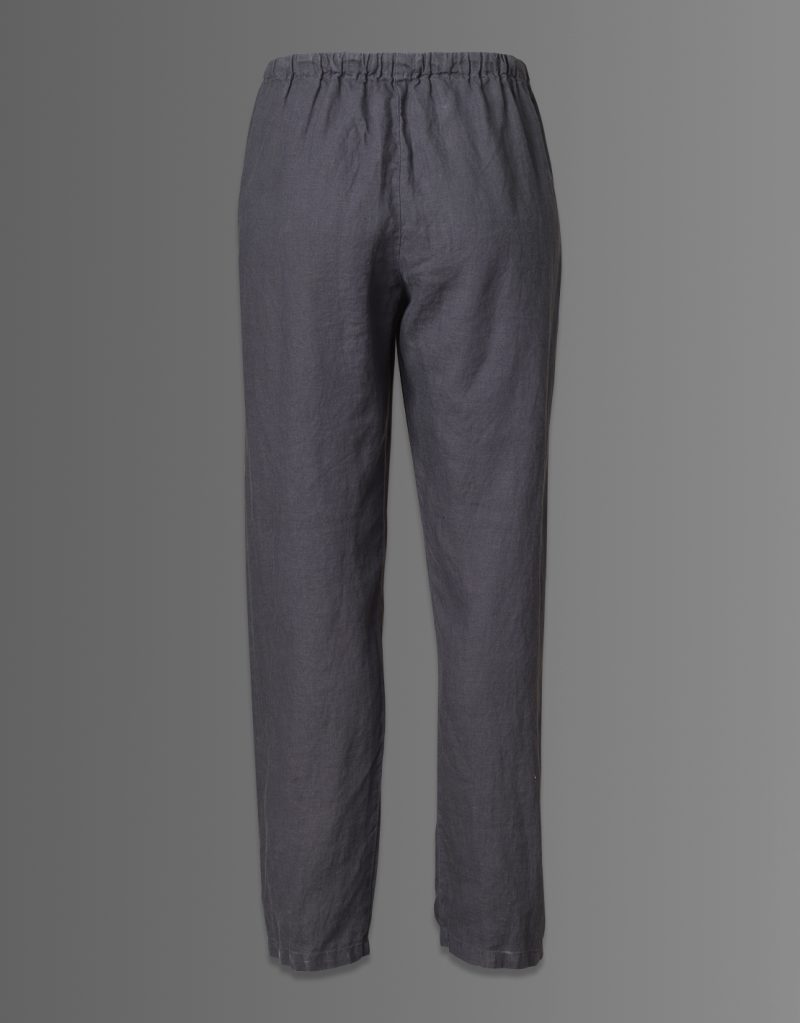 Grå linnebyxor med resår i midjan och fickor på sidan. Mjuk och skön kvalité.