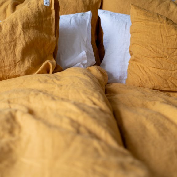 Färg: Sunflower (guldgul färg) Material: 100% tvättat linnetyg Antal delar: 2 delar: 1 påslakan 150×210 cm + 1 örngott 50×60 cm
