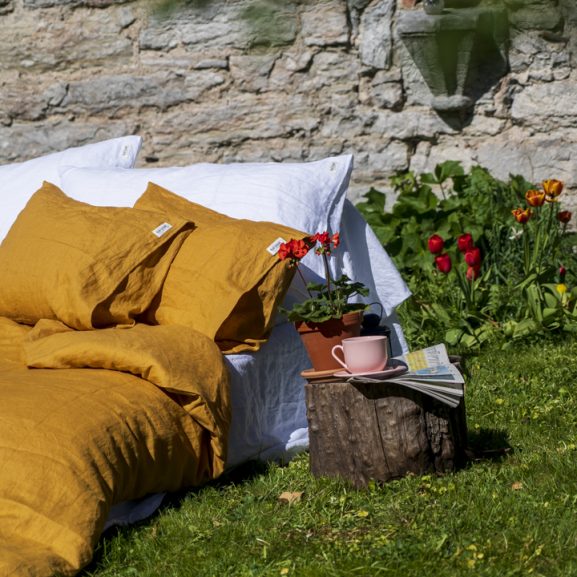 Vårt andra påslakanset från er! Det första (ljusgrått sobert) gick nästan non-stop, det nya gula (sunflower) är gladare och lyser. Men det bästa är känslan i linnelakan – de känns fräscha längre, lite speciell tyngd i tyget o inte så fladdrigt som bomullslakan. Kostar en bra slant, men jag tror inte vi går tillbaka till bomull 🙂
