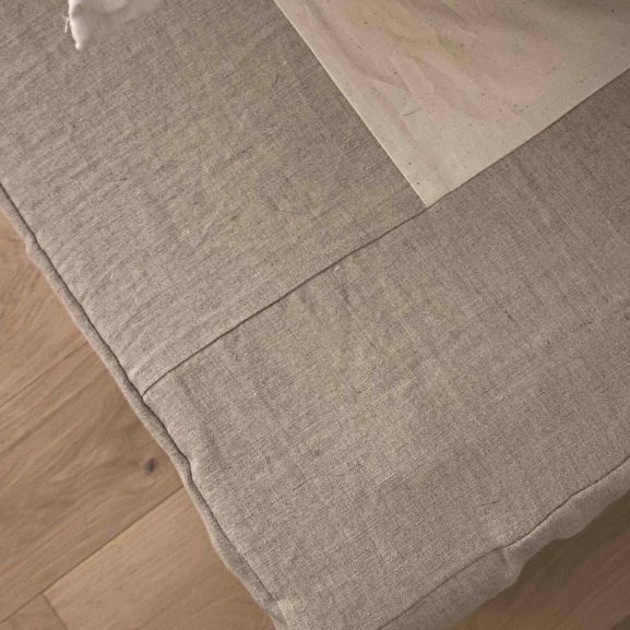 Allt synligt på sängkappan är 100 % linnetyg. Det platta tyget som ligger under madrassen och inte är synligt är i 100 % bomull. Detta för att hålla nere priset och förlänga livslängden på din sängkappa eftersom linnetyg är känsligt för friktion.