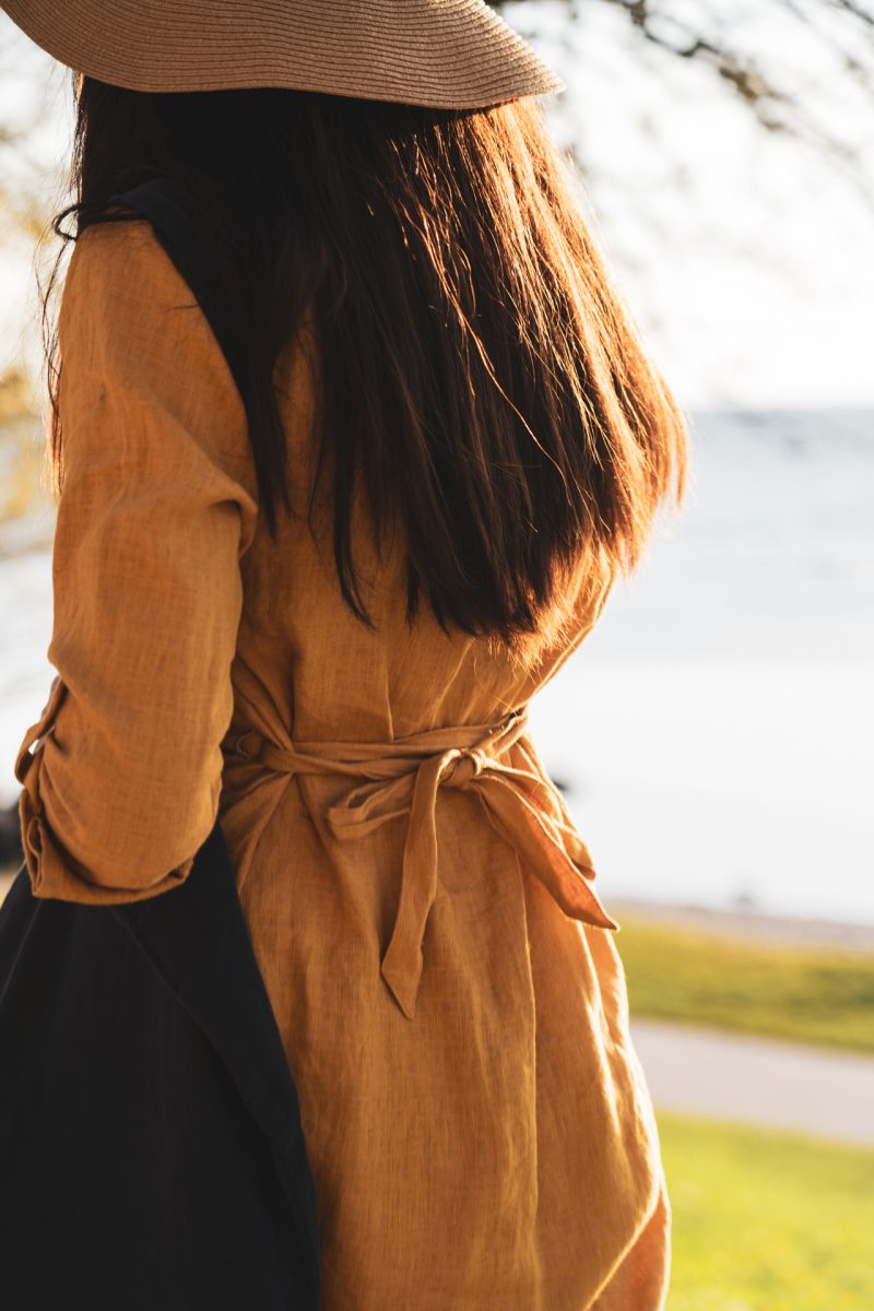 Klassisk linneskjortklänning i vacker gul färg med smickrande midjeband som kan knytas på flera olika sätt. Skjortklänningen i linne är temperaturanpassande och formar sig efter kroppen vid användning. Tvättas på 40 grader.