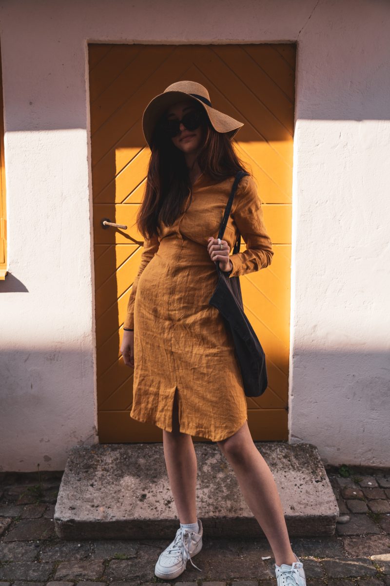 En underbar och välsittande klänning i en mild, vackert guldgul färg. Jag hade först bestämt mig för en svart, men valde den gula och den är så fin! Det blir nog även en svart framöver. Fin, lagom tjockt kvalitet på linnet, den kommer få mycket användning i sommar. Jag är 170 cm lång och beställde en storlek S och den passar perfekt. Snabb leverans, jag är jättenöjd!
